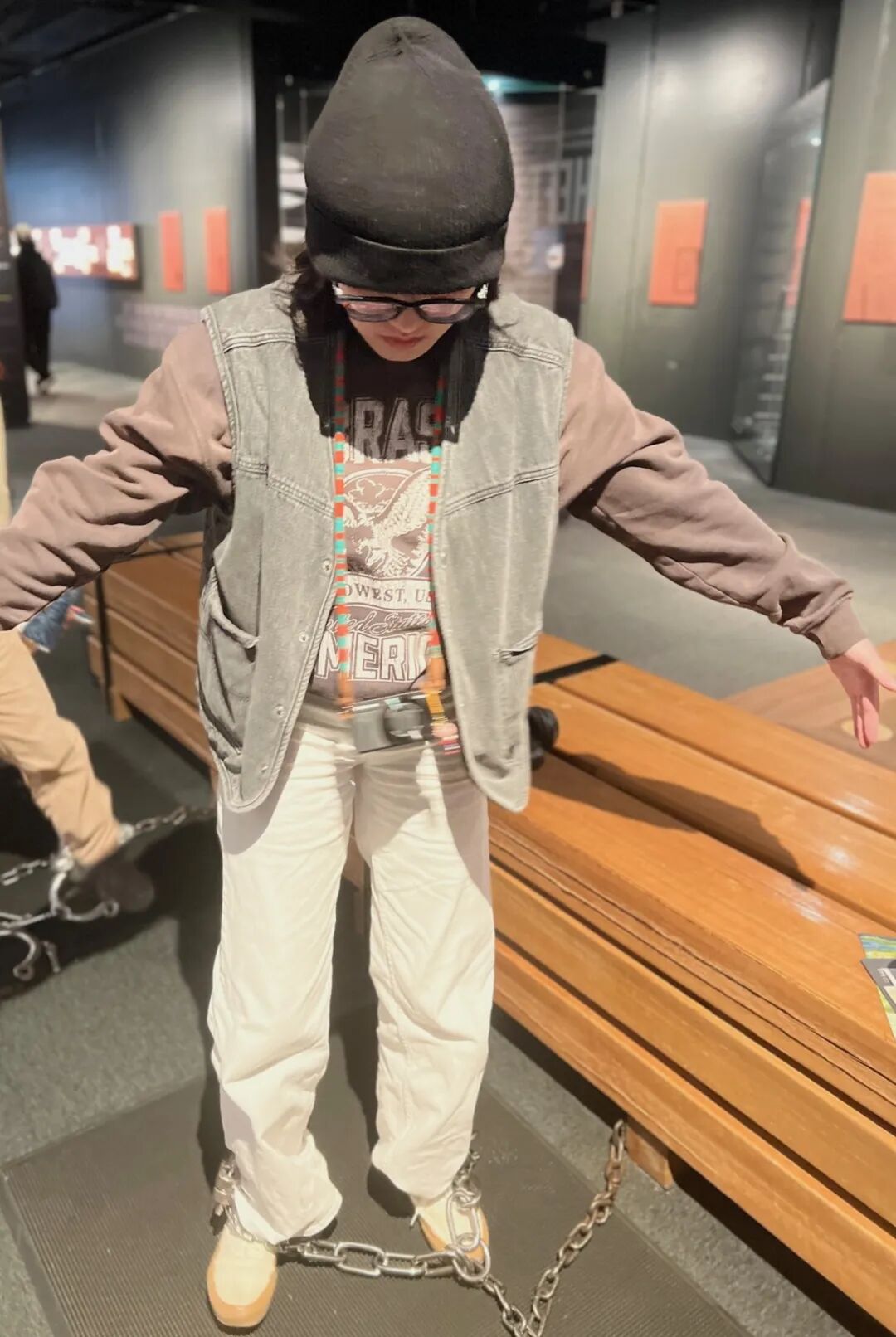 顺着故事,我们看着博物馆展出的旧物件,还沉浸式地感受了一下囚犯“脚链”。
