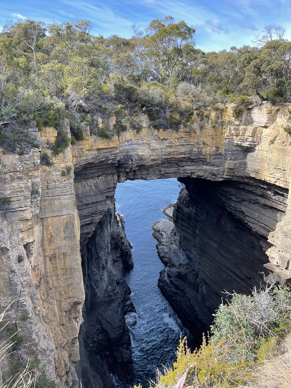 结束亚瑟港的行程,我们还在回程的路上参观了附近壮阔的自然景观,如由海水雕刻而成的棋盘道、壮观的喷水洞、巨大的塔斯曼拱门……它们在成百上千年的沉淀里,形成了鬼斧神工的地貌特征。巨型拱门。(图/朴珍珠 摄)