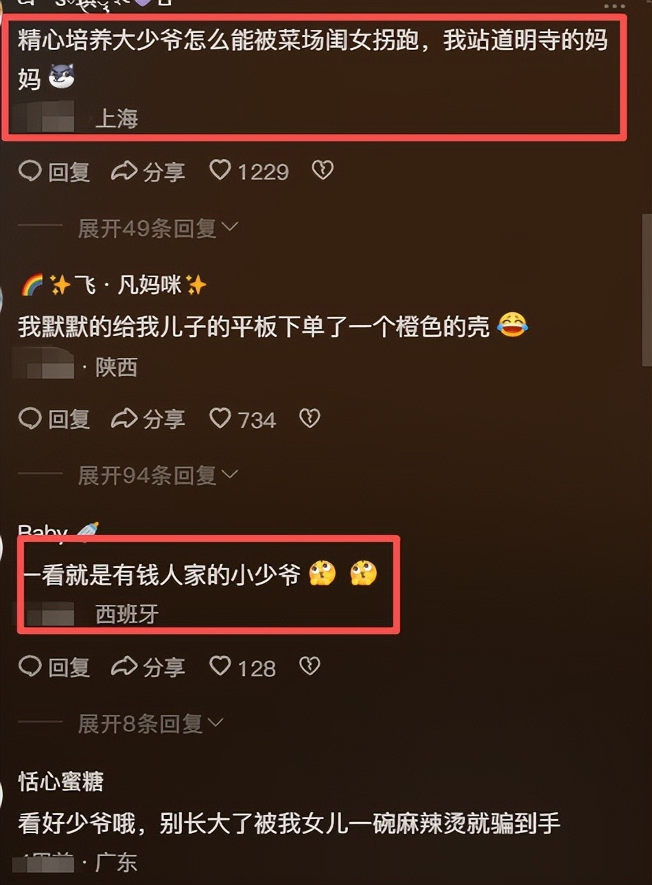也有普通家庭的家长还揣着一丝丝幻想,调侃这位小少爷的父母:看好你们家小少爷,别长大之后被我女儿一碗麻辣烫骗走了,然而,很快,这种“穷人家的女孩也能嫁豪门”的幻想就被评论区的发言击碎了。