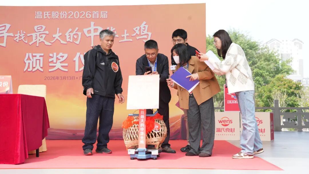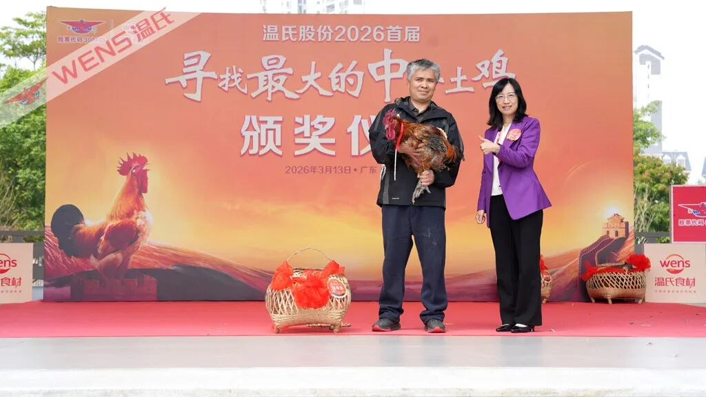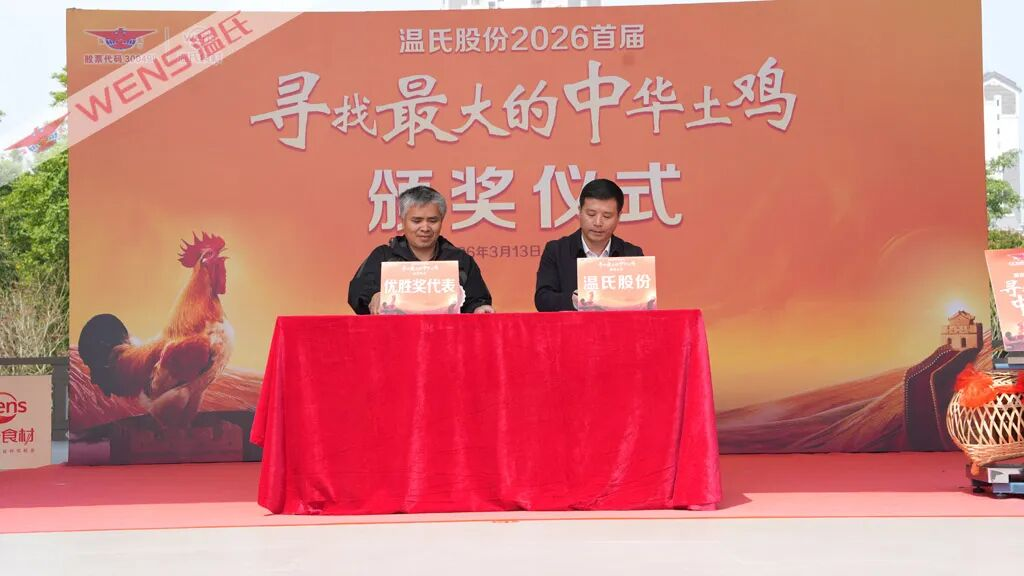 3月13日上午,温氏股份2026首届“寻找最大的中华土鸡”征集活动颁奖仪式在温氏总部聚英台隆重举行。活动同步进行了线上直播,吸引众多中华土鸡粉丝热情观看。温氏股份总裁黎少松,华南农业大学二级教授、博士生导师,动物遗传育种与繁殖学科带头人张细权,温氏股份干部员工代表,以及来自获得优胜奖的中华土鸡养殖达人代表、媒体代表齐聚一堂,共同见证中华土鸡“鸡王”的荣耀加冕,携手开启本土畜禽品种保护与推广的新篇章。
