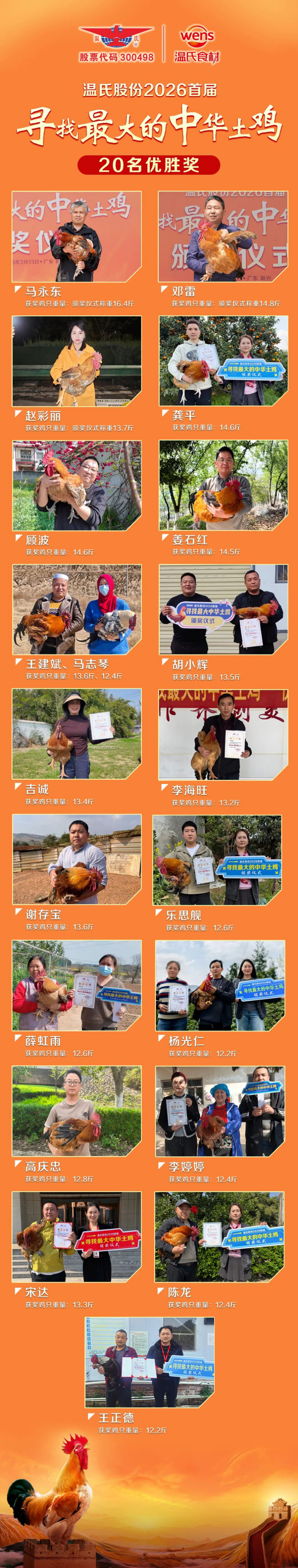目前温氏已经完成20只优胜奖鸡只回收,并向鸡只所有人颁发每斤1000元奖励和荣誉证书,全部回收鸡只,温氏将用于留种、科研、宣传等,让优良基因得以传承推广。温氏股份同时宣布,征集活动仍在继续,截止2026年6月30日,只要比今日“鸡王”更大,也可联系公司挑战,经核实后将继续回收。有意者可将您中华土鸡公鸡的图片、品种、天龄、体重以及报名人的姓名、电话、地址信息发送到邮箱xczx19950608@163.com,将有工作人员与您联系。